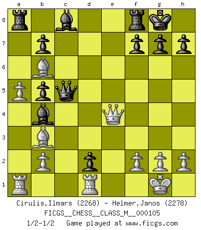 Last move : 1/2-1/2 2022 September 1 0:42:44 [Event "FICGS__CHESS__CLASS_M__000105"] [Site "FICGS"] [Date "2022.07.25"] [Round "1"] [White "Cirulis,Ilmars"] [Black "Helmer,Janos"] [Result "1/2-1/2"] [WhiteElo "2268"] [BlackElo "2278"] 1.e4 c5 2.c3 Nf6 3.e5 Nd5 4.Nf3 Nc6 5.Bc4 Nb6 6.Bb3 d5 7.exd6 Qxd6 8.O-O e5 9.d4 exd4 10.Na3 Be7 11.Nb5 Qd8 12.Bf4 O-O 13.Bc7 Qd7 14.cxd4 Nxd4 15.Nfxd4 cxd4 16.a4 a6 17.Bxb6 axb5 18.a5 d3 19.Qf3 Bb4 20.Rfd1 d2 21.Qe4 Qd6 22.Bc7 Qc5 23.Bb6 1/2-1/2 Follow this game move after move (download)If cunning alone were needed to excel, women would be the best Chess players. (Albin) Der Verteidiger gebe der Gewalt nach, aber nur der Gewalt. Er schaffe sich nicht freiwillig, etwa aus Blindheit oder aus Schrecken, irgendwelche Schwächen. Er lasse sich nicht bluffen. (Emanuel Lasker) Hasta este punto, las blancas han seguido un análisis bien conocido. Pero ahora el hace un error fatal: empieza a usar su propia cabeza. (Siegbert Tarrasch) Le pion, dans sa simplicité, marche droit devant lui, mais lorsqu'il prend, il le fait obliquement? Ainsi l'homme, tant qu'il reste pauvre, marche dans la droiture et vit honnêtement, mais lorsqu'il recherche les honneurs, il flatte, se parjure et, par les voies obliques, cherche une position supérieure sur l'échiquier du monde. (Jean de Galles) I'm extremely disappointed. I send you out for exciting, new designer drugs, you come back with tomato sauce. (Gregory House, House M.D.)