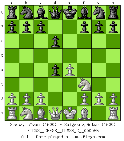 Last move : 0-1 2007 September 17 14:48:52 [Event "FICGS__CHESS__CLASS_C__000055"] [Site "FICGS"] [Date "2007.08.05"] [Round "1"] [White "Szasz,Istvan"] [Black "Saigakov,Artur"] [Result "0-1"] [WhiteElo "1600"] [BlackElo "1600"] 1.e4 e5 2.Nf3 d6 3.d4 exd4 0-1 This chess game has been lost on time (started : 2007.08.05 7:28:18) Philidor : Exchange variation Player Black won this chess game. Follow this game move after move (download)Chess is above all, a fight ! (Emanuel Lasker) Nie in meinem Leben habe ich die französische Verteidigung gespielt, welche die Stumpfsinnigste von allen ist. (Wilhelm Steinitz) El jugador blanco perdió porque fallo en recordar la coreccta continuación y tuvo que pensar por sí mismo las movidas. (Siegbert Tarrasch) Ne tendez aucun piège pour le plaisir ! Ne jouez rien dans l'espoir que l'adversaire réagisse de façon stupide ! Prenez toujours pour acquis que l'adversaire va trouver le meilleur coup ! Ne jouez jamais de coup dans l'espoir que l'adversaire ne voie pas la menace ! Chacun de vos coups doit améliorer la position d'une façon ou d'une autre. When it is a question of money, everybody is of the same religion. (Voltaire)