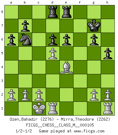 Last move : 1/2-1/2 2022 August 16 21:33:39 [Event "FICGS__CHESS__CLASS_M__000105"] [Site "FICGS"] [Date "2022.07.25"] [Round "1"] [White "Ozen,Bahadir"] [Black "Mirra,Theodore"] [Result "1/2-1/2"] [WhiteElo "2276"] [BlackElo "2262"] 1.e4 c5 2.Nf3 d6 3.d4 cxd4 4.Nxd4 Nf6 5.Nc3 a6 6.Be3 e5 7.Nb3 Be6 8.f3 h5 9.Qd2 Nbd7 10.Nd5 Bxd5 11.exd5 g6 12.O-O-O Nb6 13.Qa5 Bh6 14.Bxh6 Rxh6 15.Qd2 Rh8 16.f4 exf4 17.Qxf4 Kf8 18.Bd3 Kg7 19.Nd4 Re8 20.Ne6+ fxe6 21.Qg5 Ne4 22.Qxd8 Raxd8 23.Bxe4 1/2-1/2 Follow this game move after move (download)Tactics flow from a superior position. (Bobby Fischer) Schach ist gnadenlos. Du mußt bereit sein zu töten. (Nigel Short) Un Peón pasado aumenta su poder a medida de que el número de piezas en el tablero disminuye. (Capablanca) Un millionnaire : 'Monsieur Steinitz ! Vous ne participez aux tournois que pour l'argent, alors que moi je n'y viens que pour l'honneur.' Steinitz : 'Chacun joue pour ce qu'il n'a pas'... The beginning of wisdom is silence. The second step is listening. (Unknown)