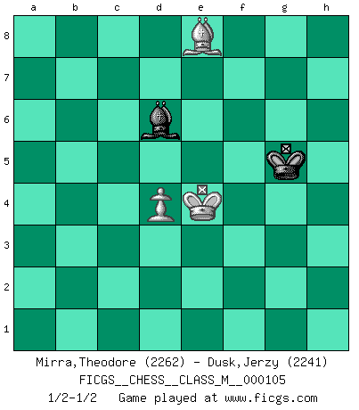 Last move : 1/2-1/2 2022 August 4 17:21:14 [Event "FICGS__CHESS__CLASS_M__000105"] [Site "FICGS"] [Date "2022.07.25"] [Round "1"] [White "Mirra,Theodore"] [Black "Dusk,Jerzy"] [Result "1/2-1/2"] [WhiteElo "2262"] [BlackElo "2241"] 1.d4 Nf6 2.c4 e6 3.Nf3 d5 4.g3 Be7 5.Bg2 O-O 6.O-O dxc4 7.Qc2 a6 8.a4 Bd7 9.Qxc4 Bc6 10.Bg5 Nbd7 11.Nc3 h6 12.Bxf6 Nxf6 13.b4 Bd5 14.Nxd5 exd5 15.Qb3 c6 16.e3 Bd6 17.Rfc1 g6 18.Nd2 Qd7 19.b5 axb5 20.axb5 Rxa1 21.Rxa1 Kg7 22.bxc6 bxc6 23.Ra6 Rb8 24.Qc2 Rc8 25.Qb2 h5 26.Nf3 Ne4 27.Qc1 c5 28.dxc5 Bxc5 29.Qb2+ Kh7 30.Bf1 Bf8 31.Bd3 Bg7 32.Qb1 Qg4 33.Kg2 Qxf3+ 34.Kxf3 Nd2+ 35.Ke2 Nxb1 36.Bxb1 Rd8 37.Bc2 Rd7 38.Kd3 f5 39.Ba4 Rd8 40.Bb3 Kh6 41.Kc2 Bf8 42.Kd3 Bg7 43.Ba2 Kh7 44.h3 Kh6 45.Ke2 Bf8 46.h4 d4 47.Bf7 Rd6 48.Rxd6 Bxd6 49.exd4 f4 50.Kf3 fxg3 51.fxg3 g5 52.hxg5+ Kxg5 53.Be8 h4 54.gxh4+ Kxh4 55.Ke4 Kg5 1/2-1/2 Follow this game move after move (download)No one ever won a game by resigning. (Unknown) Je mehr wir mit Computern analysieren, desto mehr glauben wir an Verteidigung. (Vladimir Kramnik) Un entendimiento minucioso de las típicas continuaciones de mate hacen de las mas complicadas combinaciones de sacrificio que conducen hacia ellas no solo no dificiles, sino casi un asunto de rutina. (Siegbert Tarrasch) Je ne suis pas le dernier à jouer lâchement des coups douteux pendant le zeïtnot de l'adversaire pour l'achever: en effet les coups qui font le plus peur sont ceux que l'on ne comprend pas. Je me fais souvent peur quand je joue. (Un professeur anonyme) It is not enough to be a good player... you must also play well. (Siegbert Tarrasch)