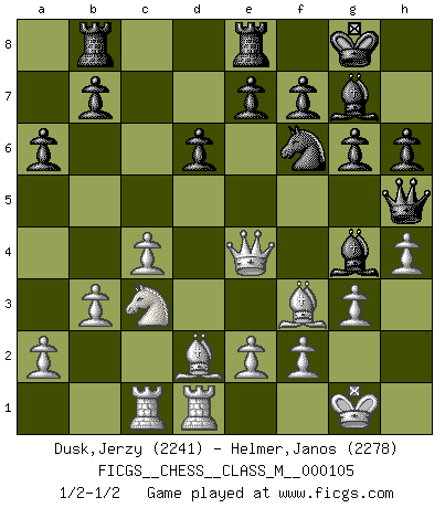 Last move : 1/2-1/2 2022 August 21 14:52:36 [Event "FICGS__CHESS__CLASS_M__000105"] [Site "FICGS"] [Date "2022.07.25"] [Round "1"] [White "Dusk,Jerzy"] [Black "Helmer,Janos"] [Result "1/2-1/2"] [WhiteElo "2241"] [BlackElo "2278"] 1.Nf3 Nf6 2.c4 c5 3.Nc3 Nc6 4.g3 g6 5.Bg2 Bg7 6.d4 cxd4 7.Nxd4 O-O 8.O-O Nxd4 9.Qxd4 d6 10.Qd3 a6 11.Bg5 Rb8 12.Rac1 Qa5 13.Bd2 Qh5 14.b3 Re8 15.h4 h6 16.Rfd1 Bg4 17.Bf3 Nd7 18.Qe4 Nf6 19.Qd3 Nd7 20.Qe4 Nf6 1/2-1/2 Follow this game move after move (download)You can only get good at Chess if you love the game. (Bobby Fischer) Schach ist eine Sache der genauen Beurteilung, wann man zuschlagen und wann man sich ducken muss. (Robert James Fischer) El Ajedrez, como la música, como el amor, tiene el poder de hacer feliz a la gente. (Siegbert Tarrasch) Le succès, c'est être capable d'aller d'échec en échec sans perdre son enthousiasme. (Winston Churchill) Wikichess, chess moves explained by 'experimented' players. (Thibault de Vassal)