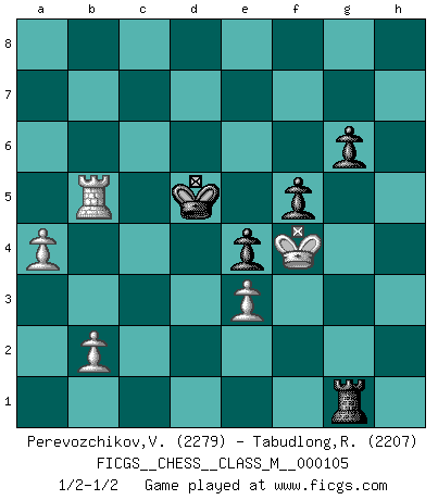 Last move : 1/2-1/2 2022 October 21 18:14:56 [Event "FICGS__CHESS__CLASS_M__000105"] [Site "FICGS"] [Date "2022.07.25"] [Round "1"] [White "Perevozchikov,Vjacheslav"] [Black "Tabudlong,Ronnie"] [Result "1/2-1/2"] [WhiteElo "2279"] [BlackElo "2207"] 1.g3 d5 2.Bg2 e5 3.Nf3 e4 4.Nd4 c5 5.Nb3 c4 6.Nd4 Bc5 7.c3 Nc6 8.d3 cxd3 9.exd3 Nf6 10.dxe4 dxe4 11.Be3 Bxd4 12.cxd4 Bg4 13.Qa4 O-O 14.Nc3 Re8 15.O-O a6 16.Rfe1 b5 17.Qc2 Rc8 18.h3 Bh5 19.Qd2 h6 20.Rac1 Qd7 21.g4 Bg6 22.a4 b4 23.Ne2 h5 24.Nf4 hxg4 25.hxg4 Qxg4 26.Qe2 Qxe2 27.Nxe2 Ne7 28.Bf1 a5 29.Rc5 Rxc5 30.dxc5 Rc8 31.Rc1 Nd7 32.Nf4 Ne5 33.Nxg6 N5xg6 34.Ba6 Rc7 35.Bb5 Ne5 36.Kf1 Nd3 37.Rc2 Nf5 38.c6 Nxe3+ 39.fxe3 Ne5 40.Rc5 f6 41.Bc4+ Nxc4 42.Rxc4 b3 43.Rc5 Kf7 44.Kg2 g6 45.Kg3 f5 46.Rxa5 Rxc6 47.Rb5 Rc1 48.Rxb3 Rg1+ 49.Kf4 Ke6 50.Rb6+ Kd5 51.Rb5+ Kd6 52.Rb6+ Kd5 53.Rb5+ Kd6 54.Rb6+ Kd5 55.Rb5+ 1/2-1/2 Follow this game move after move (download)When you see a good move, look for a better one. (Emanuel Lasker) Mutter, ich bin eben Ex-Weltmeister geworden. --beim nach Hause Kommen nach dem Verlust des WM-Titels an Mihail Botvinnik -- (Mikhail Nekhemyevich Tal) Hay dos clases de hombres: aquellos que se conforman en dejarse llevar por las circunstancias y que juegan barajas y aquellos decididos a controlar las circunstancias y que juegan al Ajedrez. (Mortimer Collins) Une platitude souvent récitée à propos des Echecs est qu'une des choses les plus difficiles à réaliser est de gagner une position gagnante. Cela ne manque pas de sens mais, pour ma part, j'ai toujours trouvé plus difficile de gagner une position perdante. (Tim Krabbe) Is not life a hundred times too short to bore ourselves ? (Friedrich Nietzsche)