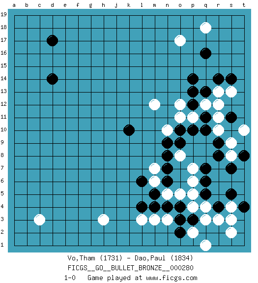 Last move : 1-0 2022 July 25 22:30:8 [Event "FICGS__GO__BULLET_BRONZE__000280"] [Site "FICGS"] [Date "2022.07.25"] [Round "1"] [Black "Vo,Tham"] [White "Dao,Paul"] [Result "1-0"] [Rating 1 "1731"] [Rating 2 "1834"] 1.q16 r3 2.d17 c3 3.d14 o17 4.q13 q18 5.r4 q3 6.q5 r11 7.r9 s13 8.o3 p4 9.n4 p5 10.q6 p6 11.q7 l3 12.n6 p7 13.k10 h3 14.q11 r10 15.q10 s9 16.r8 s8 17.n8 o8 18.n9 n5 19.m5 o5 20.l4 m6 21.l6 m7 22.n7 m3 23.m4 n3 24.o4 s4 25.s5 s2 26.t4 s3 27.o2 p2 28.p3 q4 29.s7 q1 30.s14 r13 31.r14 q12 32.p12 r12 33.p14 p11 34.p10 o11 35.o10 o12 36.p13 m12 37.t8 t10 38.s11 n10 39.o9 1-0 Follow this game move after move (download)One big eye kills one small eye. (Anonymous) If we knew what we were doing, we would not call it research. (Albert Einstein)