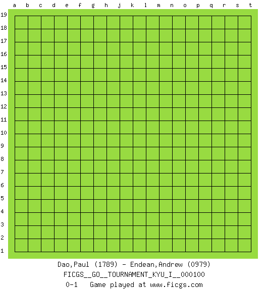 Last move : 0-1 2022 August 25 1:13:19 [Event "FICGS__GO__TOURNAMENT_KYU_I__000100"] [Site "FICGS"] [Date "2022.07.25"] [Round "1"] [Black "Dao,Paul"] [White "Endean,Andrew"] [Result "0-1"] [Rating 1 "1789"] [Rating 2 "0979"] 0-1 This go game has been lost on time (started : 2022.07.25 22:31:17) Follow this game move after move (download)The possibility or impossibility of an event results logically from the rules. (Pierre Audouard) Locking firmely the window serves nothing, only small thiefs pass through there, the big thiefs enter through the front door. (Luc-Olivier Leclerc)