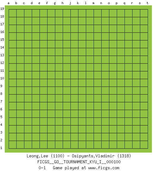 Last move : 0-1 2022 August 25 1:13:19 [Event "FICGS__GO__TOURNAMENT_KYU_I__000100"] [Site "FICGS"] [Date "2022.07.25"] [Round "1"] [Black "Leong,Lee"] [White "Osipyants,Vladimir"] [Result "0-1"] [Rating 1 "1100"] [Rating 2 "1318"] 0-1 This go game has been lost on time (started : 2022.07.25 22:31:17) Follow this game move after move (download)Use a wall to attack, not to make territory. (Anonymous) However beautiful the strategy, you should occasionally look at the results. (Winston Churchill)