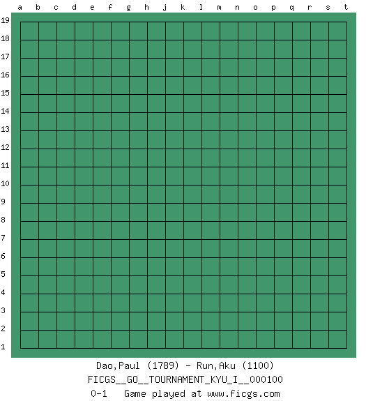 Last move : 0-1 2022 August 25 1:13:19 [Event "FICGS__GO__TOURNAMENT_KYU_I__000100"] [Site "FICGS"] [Date "2022.07.25"] [Round "1"] [Black "Dao,Paul"] [White "Run,Aku"] [Result "0-1"] [Rating 1 "1789"] [Rating 2 "1100"] 0-1 This go game has been lost on time (started : 2022.07.25 22:31:17) Follow this game move after move (download)The intersection is rarely neutral. (Pierre Audouard) Don't be irreplaceable, if you can't be replaced, you can't be promoted. (Dan Rotaru)