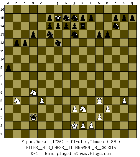 Last move : 0-1 2023 April 18 4:34:53 [Event "FICGS__BIG_CHESS__TOURNAMENT_B__000016"] [Site "FICGS"] [Date "2022.08.01"] [Round "1"] [White "Pipac,Darko"] [Black "Cirulis,Ilmars"] [Result "0-1"] [WhiteElo "1726"] [BlackElo "1891"] 1.j2-k4 m15-m13 2.h2-g4 h15-g13 3.d2-d4 g15-g14 4.e2-e4 h16-d12 5.g1-f3 d12-o2 6.p1-o3 o2-h8 7.h1-m5 n15-n13 8.k1-l3 o16-b4 9.c1-d2 b4-d2 10.b1-d2 b16-c14 11.f1-b5 d15-d13 12.n2-n4 e16-d16 13.o1-k5 h8-b8 14.j1-j2 b8-b5 15.b2-b3 b5-b8 16.m2-m3 c16-j10 17.m5-m10 b8-p8 18.m10-m5 j10-n6 19.m5-n6 p8-n6 20.k5-l4 n6-p4 21.q1-p1 f16-g15 22.l1-p5 g13-h11 23.q2-q3 p4-j10 24.p1-o1 p16-o14 25.o3-m4 j10-p10 26.o1-o5 l16-p12 27.m1-o1 p12-g4 28.h3-g4 p10-g2 29.j2-k3 g2-g4 30.e1-g1 g4-m9 31.g1-h1 h11-j13 32.a1-g1 m9-m4 33.o5-m5 m4-c13 34.c2-c4 c13-a13 35.a2-a4 a13-a9 36.h1-h5 k16-h15 37.l4-g8 a9-n9 38.g1-g2 g15-f14 39.p5-f14 e15-f14 40.g8-e6 n9-p9 41.o1-o2 c14-e13 42.q3-q4 e13-g12 43.d4-d5 p9-p3 44.o2-o5 p3-q4 45.o5-p5 q16-p16 46.p2-p3 q4-q10 47.p5-q5 q10-p10 48.q5-p5 p10-g2 49.p3-p4 g2-f2 50.p5-o5 f2-p11 51.p4-p5 p11-p8 52.c4-c5 d16-d14 53.c5-c6 a16-e16 54.b3-b4 e16-e9 55.b4-b5 p8-a8 56.b5-b6 a8-a4 57.b6-b7 e9-e6 58.d5-e6 a4-c6 59.o5-o6 c6-b7 60.f3-g5 d14-e14 61.l3-j4 m16-m14 62.d2-f3 m14-l14 63.e4-e5 a15-a13 64.f3-d4 j16-h16 65.g5-f7 h16-g15 66.d4-f5 g16-e15 67.j4-g5 a13-a12 68.g5-h7 a12-a11 69.h7-f8 a11-a10 70.f8-d7 a10-a9 71.f7-d6 b7-b9 72.d7-c5 b15-b13 73.c5-d7 c15-c13 74.f5-d4 e15-f13 75.d4-b5 p16-e16 76.k4-h3 e14-e6 77.o6-e6 e16-e6 78.b5-c7 e6-k6 79.h3-k4 b9-d7 80.c7-b5 b13-b12 81.h5-j5 c13-c12 82.j5-j6 k6-j6 83.k4-j6 d7-d9 84.j3-j4 d9-k9 85.j6-k4 k9-d3 86.k3-j2 l14-k14 0-1 This big chess game has been lost on time (started : 2022.08.01 18:39:56) Follow this game move after move (download)Good positions don't win games, good moves do. (Gerald Abrahams) Drei Punkte vor allen anderen ist wie einer, der im weißen Anzug posiert, während der Rest in Müllsäcke gekleidet dasteht. (Viktor Kortschnoi) Siempre es mejor sacrificar los hombres de tu oponente. (Savielly Tartakower) Pour moi, les échecs ne sont pas un jeu mais un art. (Alexandre Alekhine) Tomorrow's what you make of it. (Horatio Caine, C.S.I. Miami)