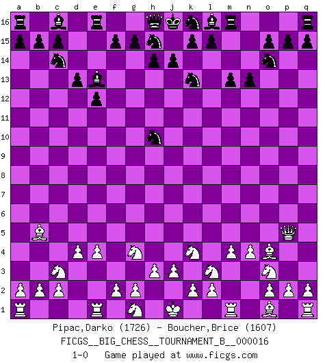 Last move : 1-0 2022 October 11 12:15:15 [Event "FICGS__BIG_CHESS__TOURNAMENT_B__000016"] [Site "FICGS"] [Date "2022.08.01"] [Round "1"] [White "Pipac,Darko"] [Black "Boucher,Brice"] [Result "1-0"] [WhiteElo "1726"] [BlackElo "1607"] 1.j2-k4 p16-o14 2.h2-g4 m15-m13 3.b1-c3 n15-n13 4.p1-o3 e15-e13 5.e2-e4 d15-d13 6.h1-m5 e13-e12 7.d2-d4 b16-c14 8.n2-n4 j15-k13 9.m2-m4 o16-j11 10.m5-n5 f16-d14 11.c1-k8 d14-e13 12.k1-l3 g16-f14 13.l1-o4 f14-g12 14.f1-b5 j11-h10 15.k8-h10 g12-h10 16.n5-p5 1-0 This big chess game has been lost on time (started : 2022.08.01 18:39:56) Follow this game move after move (download)Could we look into the head of a Chess player, we should see there a whole world of feelings, images, ideas, emotion and passion. (Alfred Binet) Kombinieren und Schwarzhandel gehören verboten. (Savielly Grigorievitsch Tartakower) Una victoria por una combinación errónea, aunque sea espectacular, me llena de horror artístico. (Wilhelm Steinitz) Si rien de grave n'est détecté lors de l'analyse d'une position, on joue alors le coup. Seconde règle de Blumenfeld. It is a good thing for an uneducated man to read books of quotations. (Winston Churchill)