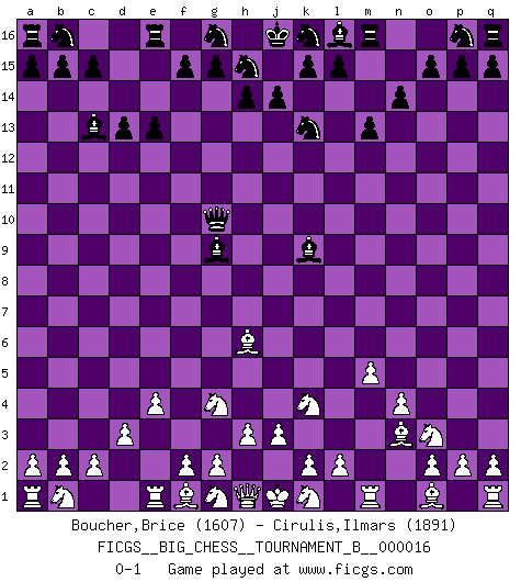 Last move : 0-1 2022 October 9 22:40:58 [Event "FICGS__BIG_CHESS__TOURNAMENT_B__000016"] [Site "FICGS"] [Date "2022.08.01"] [Round "1"] [White "Boucher,Brice"] [Black "Cirulis,Ilmars"] [Result "0-1"] [WhiteElo "1607"] [BlackElo "1891"] 1.j2-k4 m15-m13 2.m2-m4 j15-k13 3.n2-n4 h16-o10 4.h2-g4 d15-d13 5.e2-e4 c16-k9 6.d2-d3 n15-n14 7.p1-o3 o10-g10 8.m4-m5 o16-g9 9.l1-n3 e15-e13 10.c1-h6 f16-c13 0-1 This big chess game has been lost on time (started : 2022.08.01 18:39:56) Follow this game move after move (download)Though most people love to look at the games of the great attacking masters, some of the most successful players in history have been the quiet positional players. They slowly grind you down by taking away your space, tying up your pieces, and leaving you with virtually nothing to do ! (Yasser Seirawan) Es genügt nicht ein guter Spieler zu sein, man muß auch gut spielen. (Siegbert Tarrasch) El Ajedrez es un invernadero donde los frutos del carácter pueden madurar mas completamente que en la vida. (Edward Morgan Foster) Aux échecs, l'amour-propre est satisfait quand on remporte la victoire, mais il n'y a pas de honte à être battu. (Benjamin Franklin) Warrior pose battles inner weakness and wins focus. You see that there is no war within you. You're on your own side, and you are your own strength. (Terri Guillemets)