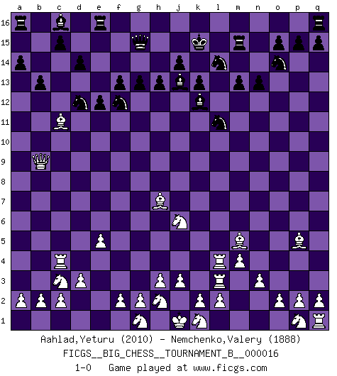 Last move : 1-0 2022 November 23 14:24:28 [Event "FICGS__BIG_CHESS__TOURNAMENT_B__000016"] [Site "FICGS"] [Date "2022.08.01"] [Round "1"] [White "Aahlad,Yeturu"] [Black "Nemchenko,Valery"] [Result "1-0"] [WhiteElo "2010"] [BlackElo "1888"] 1.j2-k4 m15-m13 2.h1-o7 h15-g13 3.e2-e4 p16-o14 4.f1-b5 l16-m15 5.b1-c3 m15-j12 6.b5-j12 h14-h13 7.j12-g10 g16-h14 8.o7-l7 e15-e13 9.l7-l15 k16-l14 10.d2-d3 m16-m15 11.l15-b6 b16-c14 12.m2-m4 k15-k13 13.l1-p5 h14-j12 14.c1-l9 n15-n13 15.l9-g13 f15-f14 16.g13-d10 g15-g13 17.e4-e5 d15-d14 18.e1-e4 f16-j13 19.b6-b9 j16-k15 20.n2-n3 a15-a14 21.o1-h7 f14-f13 22.e4-c4 j15-g14 23.a1-e1 e13-e12 24.m1-m3 h16-g15 25.m3-l3 o16-k12 26.e1-e4 g14-f12 27.g10-m5 c14-d12 28.k4-j6 b15-b13 29.e4-l4 j12-l11 30.d10-c11 1-0 This big chess game has been lost on time (started : 2022.08.01 18:39:56) Follow this game move after move (download)Play the opening like a book, the middle game like a magician, and the endgame like a machine. (Spielmann) Moralische Siege zählen nicht. (Savielly Grigorievitsch Tartakower) Cuando me preguntan: -¿Cual es el secreto que te hace hacer mejores movidas que tus oponentes?, Yo respondo: Me da gusto que me pregunten eso, porque, como veran, hay una simple razón. Yo pienso mis propias movidas y dejo a mi oponente que el piense las suyas. (Alexander Alekhine) Si je n'étais pas joueur d'échecs, je serais le meilleur dans quelque chose d'autre. (Anatoli Karpov) When I took office, only high energy physicists had ever heard of what is called the World Wide Web... Now even my cat has its own page. (Bill Clinton, 1996)