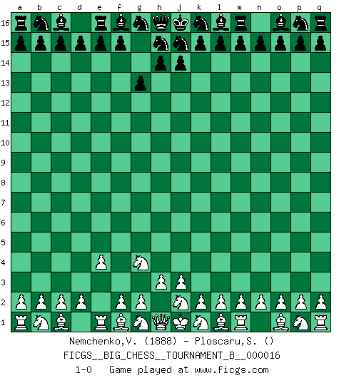 Last move : 1-0 2022 August 21 0:9:22 [Event "FICGS__BIG_CHESS__TOURNAMENT_B__000016"] [Site "FICGS"] [Date "2022.08.01"] [Round "1"] [White "Nemchenko,Valery"] [Black "Ploscaru,Stelian"] [Result "1-0"] [WhiteElo "1888"] [BlackElo ""] 1.h2-g4 g15-g13 2.e2-e4 1-0 Follow this game move after move (download)I played Chess with him and would have beaten him sometimes only he always took back his last move, and ran the game out differently. (Mark Twain) Wenn ich gewinne bin ich ein Genie. Wenn nicht, dann bin ich keines. (Robert James Fischer) Todo lo que importa ante el tablero de Ajedrez son buenas jugadas. (Bobby Fischer) Celui qui prend des risques peut perdre, celui qui n'en prend pas perd toujours. (Xavier Tartacover) Experience is the name we all give to our mistakes. (Oscar Wilde)