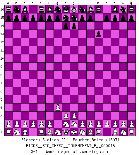 Last move : 0-1 2022 August 19 23:24:27 [Event "FICGS__BIG_CHESS__TOURNAMENT_B__000016"] [Site "FICGS"] [Date "2022.08.01"] [Round "1"] [White "Ploscaru,Stelian"] [Black "Boucher,Brice"] [Result "0-1"] [WhiteElo ""] [BlackElo "1607"] 1.g2-g4 m15-m13 0-1 Follow this game move after move (download)Methodical thinking is of more use in Chess than inspiration. (C. J. S. Purdy) Schach ist Kampf, hauptsächlich jedoch gegen die eigenen Fehler. (Savielly Grigorievitsch Tartakower) Es el objetivo de la escuela moderna no tratar cada posición de acuerdo a una regla general, sino de acuerdo al principio inherente en la posición. (Richard Reti) Les Echecs sont et restent toujours un combat, un combat intégral comme la boxe, la lutte ou un autre sport, et où il doit y avoir un vainqueur et un vaincu. (Joseph Emil Diemer) Success without honor is an unseasoned dish; it will satisfy your hunger, but it won't taste good. (Joe Paterno)