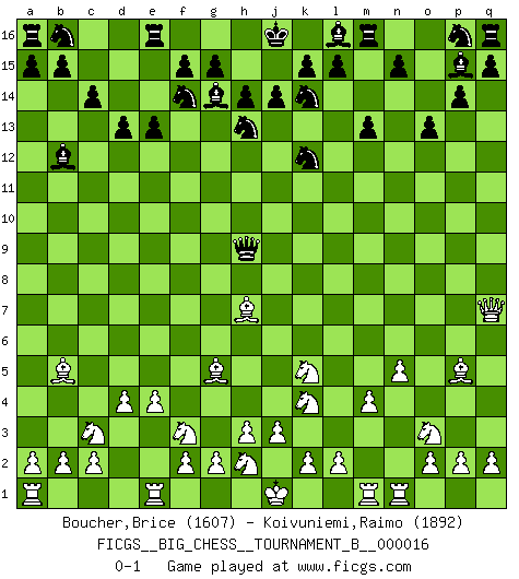 Last move : 0-1 2022 October 7 14:46:56 [Event "FICGS__BIG_CHESS__TOURNAMENT_B__000016"] [Site "FICGS"] [Date "2022.08.01"] [Round "1"] [White "Boucher,Brice"] [Black "Koivuniemi,Raimo"] [Result "0-1"] [WhiteElo "1607"] [BlackElo "1892"] 1.j2-k4 j15-h13 2.h1-o7 m15-m13 3.m2-m4 d15-d13 4.n2-n4 p15-p14 5.b1-c3 o15-o13 6.e2-e4 h16-n11 7.n4-n5 h15-k14 8.d2-d4 n11-f11 9.g1-f3 o16-p15 10.p1-o3 c16-f13 11.o1-k5 c15-c14 12.l1-p5 f13-g14 13.o7-q7 e15-e13 14.c1-g5 f16-b12 15.f1-b5 k16-l14 16.q1-n1 l14-k12 17.k1-l3 f11-j8 18.k5-h7 j8-h9 19.l3-k5 g16-f14 0-1 This big chess game has been lost on time (started : 2022.08.01 18:39:56) Follow this game move after move (download)By this measure (on the gap between Fischer & his contemporaries), I consider him the greatest world champion. (Garry Kasparov) Spielt Blackmar-Diemer-Gambit, und das Matt kommt von selbst! (Emil Joseph Diemer) El jugador blanco perdió porque fallo en recordar la coreccta continuación y tuvo que pensar por sí mismo las movidas. (Siegbert Tarrasch) Pour moi, les échecs ne sont pas un jeu mais un art. (Alexandre Alekhine) Wisdom begins at the end. (Daniel Webster)