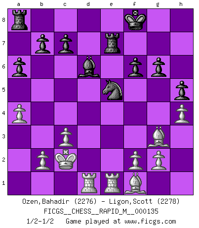 Last move : 1/2-1/2 2022 August 29 13:25:46 [Event "FICGS__CHESS__RAPID_M__000135"] [Site "FICGS"] [Date "2022.08.04"] [Round "1"] [White "Ozen,Bahadir"] [Black "Ligon,Scott"] [Result "1/2-1/2"] [WhiteElo "2276"] [BlackElo "2278"] 1.e4 e5 2.Nf3 Nf6 3.Nxe5 Nxe4 4.Qe2 Qe7 5.Qxe4 d6 6.d4 dxe5 7.dxe5 Nc6 8.Nc3 Qxe5 9.Qxe5+ Nxe5 10.Bf4 Bd6 11.Bg3 h5 12.O-O-O f6 13.h4 Bd7 14.Nb5 Bxb5 15.Bxb5+ Kf8 16.Rhe1 g6 17.c3 Rh7 18.Kc2 Re7 19.a4 a6 20.Bf1 1/2-1/2 Follow this game move after move (download)Only sissies Castle. (Rob Sillars) Im Fernschach kannst du während dem Spiel rauchen. (John Christen Knudsen) La partida mas dura de ganar es una partida ganada. (Emanuel Lasker) Il n'y a plus de joueurs du niveau de Jacob Murray dont la seule quête est le beau jeu, le plaisir de voir les pièces construire quelque chose. Sur 10 idées à la minute, 9 seront sans intérêt, la dernière s'avèrera géniale. (Christian Bauer) Men never do evil so completely and cheerfully as when they do it from religious conviction. (Blaise Pascal)