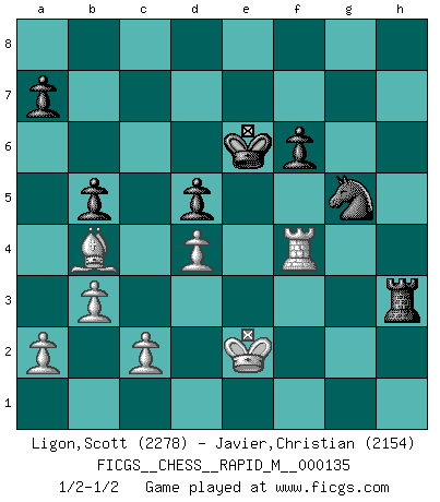 Last move : 1/2-1/2 2022 September 19 3:11:41 [Event "FICGS__CHESS__RAPID_M__000135"] [Site "FICGS"] [Date "2022.08.04"] [Round "1"] [White "Ligon,Scott"] [Black "Javier,Christian"] [Result "1/2-1/2"] [WhiteElo "2278"] [BlackElo "2154"] 1.e4 e5 2.f4 exf4 3.Bc4 Nc6 4.Nf3 g5 5.d4 Bg7 6.h4 h6 7.Nc3 d6 8.Qd3 Bd7 9.hxg5 hxg5 10.Rxh8 Bxh8 11.e5 Kf8 12.Bd2 Bg7 13.e6 Nb4 14.Qf5 Nh6 15.Qh7 Bxe6 16.Bxe6 Qe7 17.Ne4 Qxe6 18.Bxb4 Re8 19.Nfxg5 Qg4 20.Kf1 Nf5 21.Qh3 Qxh3 22.gxh3 f6 23.Nxd6 cxd6 24.Nf3 Kf7 25.Kf2 d5 26.b3 Ng3 27.Re1 Ne4+ 28.Kg2 b5 29.Nh4 Rg8 30.Kf3 Rh8 31.Nf5 Rxh3+ 32.Kg4 Rh2 33.Kxf4 Bh6+ 34.Nxh6+ Rxh6 35.Rf1 Ng5 36.Ke3 Ke6 37.Rf4 Rh3+ 38.Ke2 Rh1 39.Kd3 Rh3+ 40.Ke2 1/2-1/2 Follow this game move after move (download)Bobby just drops the pieces and they fall on the right squares. (Miguel Najdorf) Ivan Sokolov treibt mich als Beifahrer an mit go Loeky go - . (Loek van Wely) Bobby Fischer es el mas grande genio de Ajedrez de todos los tiempos. (Alexander Kotov) Plusieurs personnes se sont demandées comment Tal faisait pour gagner... En fait, c'est très simple ! Il met ses pièces au centre de l'échiquier et les sacrifie quelque part ! (David Bronstein) Home computers are being called upon to perform many new functions, including the consumption of homework formerly eaten by the dog. (Doug Larson)