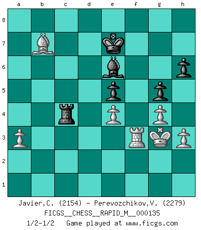 Last move : 1/2-1/2 2022 November 11 9:15:1 [Event "FICGS__CHESS__RAPID_M__000135"] [Site "FICGS"] [Date "2022.08.04"] [Round "1"] [White "Javier,Christian"] [Black "Perevozchikov,Vjacheslav"] [Result "1/2-1/2"] [WhiteElo "2154"] [BlackElo "2279"] 1.d4 d5 2.c4 dxc4 3.Nf3 c5 4.e4 cxd4 5.Qxd4 Qxd4 6.Nxd4 a6 7.Bxc4 e5 8.Nf3 Nc6 9.O-O Nf6 10.Nc3 Bg4 11.Be3 Rc8 12.Ng5 Bh5 13.Rac1 Bd6 14.Nd5 Nxd5 15.Bxd5 Ke7 16.g4 Bg6 17.Rfd1 f6 18.Ne6 Nb4 19.Rxc8 Rxc8 20.Bxb7 Rb8 21.Bc5 Bxc5 22.Nxc5 Be8 23.a3 Nc2 24.Kg2 a5 25.Rd2 Nd4 26.f4 a4 27.Bd5 Rc8 28.fxe5 fxe5 29.Nd3 Kd6 30.Ne1 h6 31.Nf3 Nxf3 32.Kxf3 Ke7 33.Bb7 Rb8 34.Bd5 Bd7 35.Kg3 g5 36.h3 Rf8 37.Rd3 Bb5 38.Rd1 Bd7 39.Rc1 Rf6 40.Rc7 Rb6 41.Rc2 Rf6 42.Kg2 Rb6 43.Kf3 Rf6+ 44.Kg2 Rb6 45.Kg3 Rf6 46.Rc3 Rb6 47.b4 axb3 48.Bxb3 Rc6 49.Rf3 Ra6 50.Bc4 Ra4 51.Bd5 Be6 52.Bc6 Rc4 53.Bb7 1/2-1/2 Follow this game move after move (download)You can only get good at Chess if you love the game. (Bobby Fischer) Als ich elf wurde, wurde ich einfach gut. (Robert James Fischer) No todos los artistas son jugadores de Ajedrez, pero todos los jugadores de Ajedrez son artistas. (Marcel Duchamp) Même si vous avez un bon coup à faire, regardez toujours s'il n'y en a pas un qui lui soit préférable. (Pedro Damiano) Panic is a sudden desertion of us, an a going over to the enemy of our imagination. (Christian Nevell Bovee)