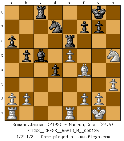 Last move : 1/2-1/2 2022 September 18 1:6:1 [Event "FICGS__CHESS__RAPID_M__000135"] [Site "FICGS"] [Date "2022.08.04"] [Round "1"] [White "Romano,Jacopo"] [Black "Maceda,Coco"] [Result "1/2-1/2"] [WhiteElo "2192"] [BlackElo "2276"] 1.e4 e5 2.Nf3 Nc6 3.Bb5 a6 4.Ba4 Nf6 5.O-O Be7 6.Re1 b5 7.Bb3 O-O 8.d3 d6 9.c3 Na5 10.Bc2 c5 11.Nbd2 Nc6 12.Nf1 Re8 13.h3 h6 14.Ng3 Be6 15.d4 cxd4 16.cxd4 exd4 17.Nxd4 Nxd4 18.Qxd4 Rc8 19.Bb3 d5 20.e5 Nd7 21.Nh5 Bc5 22.Qf4 Qg5 23.Qxg5 hxg5 24.Bxg5 d4 25.Bxe6 Rxe6 26.Bf4 1/2-1/2 Follow this game move after move (download)Via the squares on the chessboard, the Indians explain the movement of time and the age, the higher influences which control the world and the ties which link Chess with the human soul. (Al-Masudi) Ein Teil des Fehlers ist immer korrekt. (Savielly Grigorievitsch Tartakower) EL Ajedrez es como la vida. (Boris Spassky) Le profane ne songe pas à la somme de jouissance dont il se prive, qui méconnaît ce jeu aux ressources aussi variées que passionnantes. (Jean-Marie Jeanton-Lamarche) Life doesn't imitate art, it imitates bad television. (Woody Allen)