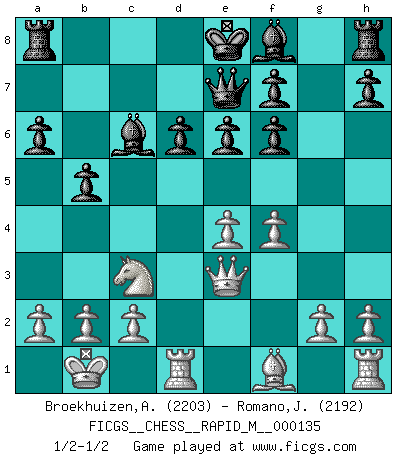 Last move : 1/2-1/2 2022 August 12 10:53:19 [Event "FICGS__CHESS__RAPID_M__000135"] [Site "FICGS"] [Date "2022.08.04"] [Round "1"] [White "Broekhuizen,A. T. S."] [Black "Romano,Jacopo"] [Result "1/2-1/2"] [WhiteElo "2203"] [BlackElo "2192"] 1.e4 c5 2.Nf3 d6 3.d4 cxd4 4.Nxd4 Nf6 5.Nc3 Nc6 6.Bg5 e6 7.Qd2 a6 8.O-O-O Bd7 9.f4 b5 10.Bxf6 gxf6 11.Nxc6 Bxc6 12.Qe3 Qe7 13.Kb1 1/2-1/2 Follow this game move after move (download)Nowadays, when you're not a grandmaster at 14, you can forget about it. (Anand Viswanathan) Ich verlor meine Bürgerrechte, mein Gehalt wurde mir nicht mehr bezahlt und ich wurde zensiert und durfte nicht mehr ins Ausland reisen. [nach dem Match Fischer-Taimanov 6:0] (Mark Taimanov) Observen a Garry Kasparov. Después de una derrota, invariablemente el gana la próxima partida. Prácticamente hace pedazos a su siguiente oponente. Eso es algo que tenemos que aprender a lograr. (Maurice Ashley) Ne tendez aucun piège pour le plaisir ! Ne jouez rien dans l'espoir que l'adversaire réagisse de façon stupide ! Prenez toujours pour acquis que l'adversaire va trouver le meilleur coup ! Ne jouez jamais de coup dans l'espoir que l'adversaire ne voie pas la menace ! Chacun de vos coups doit améliorer la position d'une façon ou d'une autre. Whenever people agree with me, I always feel I must be wrong. (Oscar Wilde)