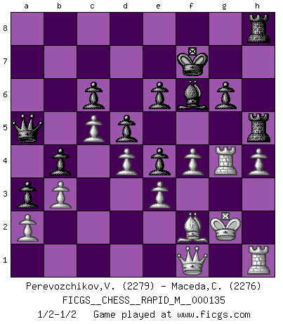 Last move : 1/2-1/2 2022 November 10 19:29:29 [Event "FICGS__CHESS__RAPID_M__000135"] [Site "FICGS"] [Date "2022.08.04"] [Round "1"] [White "Perevozchikov,Vjacheslav"] [Black "Maceda,Coco"] [Result "1/2-1/2"] [WhiteElo "2279"] [BlackElo "2276"] 1.Nf3 Nf6 2.b3 d5 3.Bb2 Bf5 4.Nh4 Bd7 5.g3 e6 6.Bg2 Be7 7.c4 O-O 8.d4 a5 9.O-O a4 10.Nf3 a3 11.Bc1 b5 12.c5 b4 13.Ne5 Bb5 14.Nd2 h6 15.f4 Qe8 16.Re1 Nc6 17.Nxc6 Bxc6 18.Nf3 Rb8 19.Bd2 Ne4 20.Ne5 f5 21.Bxe4 fxe4 22.e3 Bf6 23.Nxc6 Qxc6 24.Rf1 g6 25.h4 Kf7 26.Be1 h5 27.Rc1 Rh8 28.Rc2 Qb5 29.R1f2 Qa6 30.Rg2 Qb5 31.Rh2 c6 32.Rcg2 Rh6 33.g4 hxg4 34.Rxg4 Rbh8 35.Kg2 Rh5 36.Bf2 Rf5 37.Rh1 Rfh5 38.Qf1 Qa5 1/2-1/2 Follow this game move after move (download)Place the contents of the Chess box in a hat, shake them up vigorously, pour them on the board from a height of two feet, and you get the style of Steinitz. (H. E. Bird) Es genügt nicht ein guter Spieler zu sein, man muß auch gut spielen. (Siegbert Tarrasch) Un buen sacrificio es aquel que aunque no sea necesariamente sólido, deja a tu oponente aturdido y confuso. (Rudolph Spielmann) J'ai toujours senti une vague pitié pour l'homme qui ne connaît rien aux échecs, tout comme j'en aurais pour un homme ignorant de l'amour. Les Echecs, comme la musique ou comme l'amour, ont le pouvoir de rendre heureux. (Siegbert Tarrasch) As a goal marker shodan is important. As a destination it is a poor place to stop. (Thomas Tamayo)