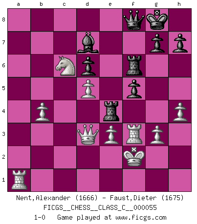 Last move : 1-0 2007 October 9 19:30:31 [Event "FICGS__CHESS__CLASS_C__000055"] [Site "FICGS"] [Date "2007.08.05"] [Round "1"] [White "Nent,Alexander"] [Black "Faust,Dieter"] [Result "1-0"] [WhiteElo "1666"] [BlackElo "1675"] 1.d4 e6 2.c4 Nf6 3.Nc3 Bb4 4.Qc2 O-O 5.a3 Bxc3+ 6.Qxc3 Ne4 7.Qc2 f5 8.Nh3 Nc6 9.e3 Qh4 10.g3 Qh5 11.Nf4 Qf7 12.Bg2 d6 13.Nd3 e5 14.d5 Ne7 15.f3 Nf6 16.O-O Bd7 17.Bd2 Qh5 18.Bc3 Rae8 19.Rae1 a6 20.b3 Ng6 21.Qd2 Nh8 22.Bb2 Nf7 23.Rf2 Ng5 24.a4 e4 25.Bxf6 Rxf6 26.Nf4 Qf7 27.Qa5 Bc8 28.fxe4 Nxe4 29.Bxe4 Rxe4 30.Qc3 b6 31.a5 Qe8 32.Rf3 Qe7 33.Kg2 Rh6 34.axb6 cxb6 35.Nh3 Qe8 36.Nf2 Re5 37.Qd4 Qh5 38.h4 b5 39.cxb5 axb5 40.Nd3 Re4 41.Qb6 Qe8 42.Rc1 Re7 43.Nb4 Rf6 44.Kf2 Bd7 45.Nc6 Re4 46.Ra1 Qf8 47.Qxb5 Re5 48.Qd3 Re4 49.b4 1-0 Queen's pawn Kingside Castling by player Black (move 4) Kingside Castling by player White (move 16) Player White won this chess game. Follow this game move after move (download)Chess opens and enriches your mind. (Saudin Robovic) Am wohlsten fühle ich mich, wenn ich sehe, wie sich mein Gegner im Todeskampf windet. (Robert James Fischer) El muchacho (en ese entonces un niño de 12 años llamado Anatoly Karpov) no tiene ni idea de lo que es el Ajedrez y no hay futuro en absoluto para el en esta profesión. (Mikhail Botvinnik) Je ne crois pas en la psychologie, je crois aux bons coups. (Robert Fischer) I'll be back. (Arnold Schwarzenegger)