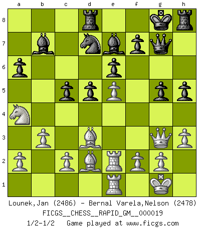 Last move : 1/2-1/2 2022 October 12 17:39:50 [Event "FICGS__CHESS__RAPID_GM__000019"] [Site "FICGS"] [Date "2022.08.04"] [Round "1"] [White "Lounek,Jan"] [Black "Bernal Varela,Nelson"] [Result "1/2-1/2"] [WhiteElo "2486"] [BlackElo "2478"] 1.e4 c5 2.Nf3 e6 3.d4 cxd4 4.Nxd4 Nc6 5.Nc3 a6 6.Nxc6 bxc6 7.Bd3 d5 8.O-O Nf6 9.Re1 Be7 10.e5 Nd7 11.Qg4 Kf8 12.b3 Bb7 13.h3 h5 14.Qf3 Kg8 15.Bf4 g5 16.Bd2 Qf8 17.Re2 Qg7 18.Rae1 Rd8 19.Qg3 c5 20.Na4 Bc6 21.Nc3 Bb7 22.Na4 1/2-1/2 Follow this game move after move (download)Not all artists are Chess players, but all Chess players are artists. (Marcel Duchamp) Das Spiel gibt uns die Genugtuung, die das Leben uns versagt. (Emanuel Lasker) Te sientas frente a un tablero y repentinamente tu corazón brinca. Tu mano tiembla al tomar una pieza y moverla. Pero lo que el Ajedrez te enseña es que tu debes permanecer ahí con calma y pensar de que si realmente es una buena idea o de que si hay otras ideas mejores. (Stanley Kubrick) L'action d'une oeuvre littéraire se déroule sur un champ de bataille. Les masques et les types du drame moderne correspondent aux pièces du jeu d'échecs. L'intrigue correspond aux coups et aux gambits, c'est à dire aux techniques du jeu telles qu'utilisées et interprétées par les joueurs. Les tactiques et les péripéties [mouvements] correspondent aux coups exécutés par l'adversaire. (Viktor Shklovsky) The hypothalamus is one of the most important parts of the brain, involved in many kinds of motivation, among other functions. The hypothalamus controls the 'Four Fs: Fighting, Fleeing, Feeding and Mating. (Unknown author)