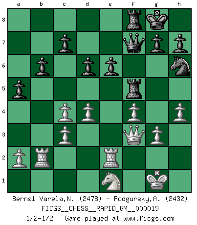 Last move : 1/2-1/2 2022 November 14 19:31:13 [Event "FICGS__CHESS__RAPID_GM__000019"] [Site "FICGS"] [Date "2022.08.04"] [Round "1"] [White "Bernal Varela,Nelson"] [Black "Podgursky,Artur"] [Result "1/2-1/2"] [WhiteElo "2478"] [BlackElo "2432"] 1.Nf3 Nf6 2.c4 e6 3.d4 b6 4.g3 Bb7 5.Bg2 Be7 6.O-O O-O 7.Nc3 Ne4 8.Bd2 f5 9.Nxe4 Bxe4 10.Ne1 Bxg2 11.Nxg2 a5 12.Re1 Nc6 13.Bc3 Bb4 14.e4 Bxc3 15.bxc3 Ne7 16.Qd3 Qe8 17.Rad1 Qf7 18.Rd2 Rad8 19.h4 fxe4 20.Rxe4 Nf5 21.Qe2 Qe7 22.Re5 Nh6 23.Ne1 Qa3 24.Qd3 Ng4 25.Rb5 Rf5 26.R5b2 Qe7 27.f3 Nh6 28.f4 Rdf8 29.Re2 Qf7 30.Qf3 d6 1/2-1/2 Follow this game move after move (download)Live, lose, and learn, by observing your opponent how to win. (Amber Steenbock) Es hat in meinem Leben Zeiten gegeben, da ich sehr nahe daran war zu glauben, daß ich auch nicht eine einzige Schachpartie verlieren könnte. (José Raúl Capablanca) Estaba muy claro de que el punto vulnerable del Gran Maestro Americano (Bobby Fischer) radicaba en las posiciones de doble filo, colgantes, irracionales, donde el siempre falló en encontrar un triunfo aún en una posición de clara victoria. (Efim Geller) Le joueur d'Echecs qui veut atteindre le top est obligé de développer son propre credo créatif. Alexeï Stepanovicth Souétine. Il est facile d'écrire des livres ! Ce qui est difficile, c'est de jouer ! (Alexeï Stepanovicth Souétine) I live to kill Traxler counterattack. (Ilmars Cirulis)