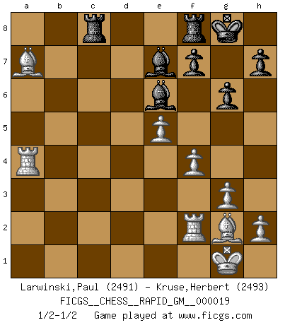 Last move : 1/2-1/2 2022 August 6 10:4:54 [Event "FICGS__CHESS__RAPID_GM__000019"] [Site "FICGS"] [Date "2022.08.04"] [Round "1"] [White "Larwinski,Paul"] [Black "Kruse,Herbert"] [Result "1/2-1/2"] [WhiteElo "2491"] [BlackElo "2493"] 1.Nf3 Nf6 2.c4 c5 3.Nc3 Nc6 4.g3 d5 5.d4 e6 6.cxd5 Nxd5 7.Bg2 cxd4 8.Nxd4 Nxc3 9.bxc3 Nxd4 10.Qxd4 Qxd4 11.cxd4 Bd6 12.O-O Rb8 13.e4 b5 14.Bd2 e5 15.Be3 O-O 16.f4 exd4 17.Bxd4 Be6 18.e5 Ba3 19.Bxa7 Rbc8 20.Rf3 Be7 21.Rf2 g6 22.a4 bxa4 23.Rxa4 1/2-1/2 Follow this game move after move (download)All that matters on the Chessboard is good moves. (Bobby Fischer) Je mehr ich von der FIDE weiss, um so weniger verstehe ich. (Alexander Kalifman) El Ajedrez expande y enriquece tu mente. (Saudin Robovic) Les écrivains ont utilisé les échecs pour analyser les côtés extrêmes de la nature humaine. Dans ce cadre, les échecs offrent un champ d'expérimentation idéal. Mais on pourrait faire la même chose avec la peinture. Et là, en vous référant à Van Gogh, vous ne tirerez pas de conclusion définitive sur les peintres. (Gary Kasparov) Chess is as much a mystery as women. (Purdy)