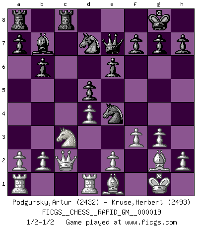 Last move : 1/2-1/2 2022 September 7 20:32:56 [Event "FICGS__CHESS__RAPID_GM__000019"] [Site "FICGS"] [Date "2022.08.04"] [Round "1"] [White "Podgursky,Artur"] [Black "Kruse,Herbert"] [Result "1/2-1/2"] [WhiteElo "2432"] [BlackElo "2493"] 1.d4 Nf6 2.c4 e6 3.g3 d5 4.Bg2 Bb4+ 5.Bd2 Be7 6.Nf3 O-O 7.O-O c6 8.Qc2 b6 9.Rd1 Nbd7 10.Bf4 Bb7 11.Ne5 Nh5 12.Bd2 Nhf6 13.cxd5 cxd5 14.Nc6 Qe8 15.Nxe7+ Qxe7 16.Nc3 Rfc8 17.Be1 Ne4 18.f3 1/2-1/2 Follow this game move after move (download)If your opponent cannot do anything active, then don't rush the position; instead you should let him sit there, suffer, and beg you for a draw. (Jeremy Silman) Ich war zu klein für die Schach-Schülermannschaft! (Woody Allen) No hay un Gran Maestro de Ajedrez que sea normal; solo se diferencían ellos por la magnitud de su locura. (Viktor Korchnoi) Pour se monter efficace, un Cavalier a besoin d'avant-postes ! Les Cavaliers font les meilleurs bloqueurs de pions passés. It's unlucky to be superstitious. (Dave Enteles)