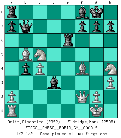 Last move : 1/2-1/2 2022 August 30 21:37:52 [Event "FICGS__CHESS__RAPID_GM__000019"] [Site "FICGS"] [Date "2022.08.04"] [Round "1"] [White "Ortiz,Clodomiro"] [Black "Eldridge,Mark"] [Result "1/2-1/2"] [WhiteElo "2392"] [BlackElo "2508"] 1.d4 d5 2.c4 c6 3.Nf3 Nf6 4.Nc3 e6 5.e3 Nbd7 6.Qc2 Bd6 7.Bd3 O-O 8.O-O dxc4 9.Bxc4 b5 10.Bd3 Bb7 11.e4 e5 12.h3 exd4 13.Nxd4 Re8 14.Nf5 Bf8 15.Rd1 b4 16.Na4 c5 17.f3 Qc7 18.b3 Ne5 19.Bb5 Re6 20.Qf2 Nxe4 21.fxe4 Bxe4 22.Nh4 c4 23.Bf4 Qb7 24.bxc4 Nd3 25.Rxd3 Bxd3 26.Nc5 1/2-1/2 Follow this game move after move (download)Tactics flow from a superior position. (Bobby Fischer) Modernes Schach sorgt sich zuviel um Dinge wie Bauernstruktur usw. Vergessen Sie das, Schachmatt beendet das Spiel! (Nigel Short) Prefiero perder una partida realmente buena, que ganar una mala. (David Levy) Il vaut toujours mieux jouer un plan faux de façon logique que de n'avoir pas de plan du tout. (Victor Kortchnoï) The real danger is not that computers will begin to think like men, but that men will begin to think like computers. (Sydney J. Harris)