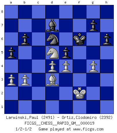 Last move : 1/2-1/2 2022 November 2 12:37:34 [Event "FICGS__CHESS__RAPID_GM__000019"] [Site "FICGS"] [Date "2022.08.04"] [Round "1"] [White "Larwinski,Paul"] [Black "Ortiz,Clodomiro"] [Result "1/2-1/2"] [WhiteElo "2491"] [BlackElo "2392"] 1.d4 Nf6 2.c4 e6 3.g3 d5 4.Nf3 Bb4+ 5.Bd2 Be7 6.Bg2 O-O 7.O-O c6 8.Qc2 b6 9.cxd5 cxd5 10.Rc1 Bb7 11.Ne5 Ne4 12.a3 Nd6 13.Bb4 Nd7 14.Nd2 a5 15.Nc6 Bxc6 16.Bxd6 Rc8 17.Bxe7 Qxe7 18.e3 Nf6 19.Bf1 h6 20.Qd1 Rfd8 21.Ba6 Rc7 22.Rc3 Bb7 23.Rxc7 Qxc7 24.Rc1 Qd7 25.Bd3 Rc8 26.Rc2 Ne8 27.Nf3 Rxc2 28.Qxc2 Qc8 29.Qxc8 Bxc8 30.Nd2 Nd6 31.f3 f5 32.Nb1 Bd7 33.Nc3 Kf7 34.b3 Be8 35.h3 Ke7 36.g4 fxg4 37.hxg4 Bd7 38.Kf2 Kf6 39.e4 dxe4 40.fxe4 e5 41.Nd5+ 1/2-1/2 Follow this game move after move (download)By this measure (on the gap between Fischer & his contemporaries), I consider him the greatest world champion. (Garry Kasparov) Das Blackmar-Diemer-Gambit verändert den ganzen Menschen! (Emil Joseph Diemer) Me gusta decir que Bobby Fischer fue el mejor jugador que jamás haya existido. Pero lo que hizo de Fischer un genio, fue su habilidad de mezclar una frescura y pragmatismo Americano con ideas Rusas acerca de la estrategia. (Bruce Pandolfini) En blitz, le Cavalier l'emporte sur le Fou. (Vlastimil Hort) If things go wrong, don't go with them. (Roger Babson)