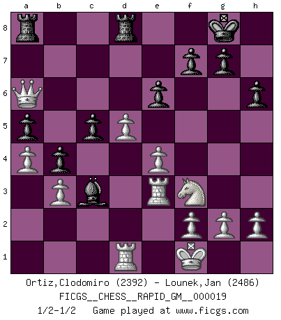 Last move : 1/2-1/2 2022 August 25 8:40:46 [Event "FICGS__CHESS__RAPID_GM__000019"] [Site "FICGS"] [Date "2022.08.04"] [Round "1"] [White "Ortiz,Clodomiro"] [Black "Lounek,Jan"] [Result "1/2-1/2"] [WhiteElo "2392"] [BlackElo "2486"] 1.d4 Nf6 2.c4 e6 3.Nf3 d5 4.Nc3 c6 5.e3 Nbd7 6.Be2 Bd6 7.b3 O-O 8.O-O b6 9.Qc2 Bb7 10.Bb2 Qe7 11.Rfe1 c5 12.Nb5 Bb8 13.cxd5 Nxd5 14.Rad1 Rc8 15.Qd3 a6 16.Nc3 N5f6 17.e4 b5 18.d5 Ne5 19.Qd2 Rd8 20.Qc1 Nfd7 21.a4 b4 22.Nb1 h6 23.Bxe5 Bxe5 24.Bc4 Bc7 25.Nbd2 Ne5 26.Nxe5 Bxe5 27.Nf3 Bc3 28.Re3 a5 29.Qc2 Ba6 30.Qe2 Qa7 31.Kf1 Bxc4 32.Qxc4 Qa6 33.Qxa6 1/2-1/2 Follow this game move after move (download)You may learn much more from a game you lose than from a game you win. You will have to lose hundreds of games before becoming a good player. (Jose Raul Capablanca) Ich verachte die Medien. (Robert James Fischer) Estaba muy claro de que el punto vulnerable del Gran Maestro Americano (Bobby Fischer) radicaba en las posiciones de doble filo, colgantes, irracionales, donde el siempre falló en encontrar un triunfo aún en una posición de clara victoria. (Efim Geller) Vous savez, camarade Pachman, je n'éprouve pas de plaisir à être ministre, je jouerais plutôt aux échecs comme vous, ou alors ferais une révolution au Venezuela. (Che Guevara à Ludek Pachman, 'Checkmate in Prague', 1975) God, you are such an idiot. - Actually, I thought I was more of a jerk. (Gregory House to Stacy Warner, House M.D.)