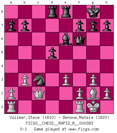 Last move : 0-1 2022 September 18 13:0:26 [Event "FICGS__CHESS__RAPID_B__000383"] [Site "FICGS"] [Date "2022.08.04"] [Round "1"] [White "Vollmer,Steve"] [Black "Benone,Mateia"] [Result "0-1"] [WhiteElo "1810"] [BlackElo "1820"] 1.d4 Nf6 2.c4 c5 3.Nf3 cxd4 4.Qxd4 Nc6 5.Qd1 e6 6.g3 d5 7.cxd5 Bb4+ 8.Bd2 Bxd2+ 9.Qxd2 exd5 10.Bg2 O-O 11.O-O Ne4 12.Qd1 Be6 13.Na3 Qb6 14.b3 Rfe8 15.Nc2 Rad8 16.Ncd4 Nc3 17.Qc2 Nxd4 18.Nxd4 Qxd4 19.e3 Qf6 0-1 Follow this game move after move (download)Chess is a part of culture and if a culture is declining then Chess too will decline. (Mikhail Botvinnik) Unter Putin wird alles Geld aus Russland wie von einem Staubsauger nach Moskau umgeleitet, das ist wie ein schwarzes Loch. (Garry Kasparov) Juega la Apertura como un libro, el Juego Medio como un mago y los Finales como una máquina. (Spielmann) Avec des compensations pour le matériel en plus... (Anonyme) What doesn't kill us makes us stronger. (Friedrich Nietzsche)