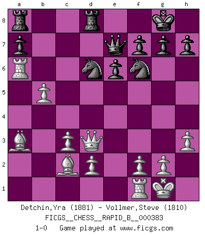 Last move : 1-0 2022 August 21 22:24:49 [Event "FICGS__CHESS__RAPID_B__000383"] [Site "FICGS"] [Date "2022.08.04"] [Round "1"] [White "Detchin,Yra"] [Black "Vollmer,Steve"] [Result "1-0"] [WhiteElo "1881"] [BlackElo "1810"] 1.e4 c5 2.Nf3 d6 3.c3 Nf6 4.h3 Nc6 5.Bd3 e6 6.Bc2 c4 7.Qe2 b5 8.a4 Ba6 9.axb5 Bxb5 10.b3 Na5 11.Na3 Bc6 12.b4 Nb7 13.Nxc4 Be7 14.Nd4 Bd7 15.e5 Nd5 16.b5 dxe5 17.Nxe5 Nd6 18.O-O O-O 19.Ndc6 Bxc6 20.Nxc6 Qc7 21.Qd3 Nf6 22.Nxe7+ Qxe7 23.Ra6 Rfd8 24.Ba3 1-0 Follow this game move after move (download)Chess is a terrible game. If you have no center, your opponent has a freer position. If you do have a center, then you really have something to worry about ! (Siegbert Tarrasch) Kein Großmeister ist normal. Sie unterscheiden sich nur im Ausmaß Ihrer Verrücktheit. (Viktor Kortschnoi) Me dio la sensación de como si yo estuviera jugando en contra del mismo Ajedrez. - al estar jugando en contra de Robert Fischer (Walter Shipman) Demandez au pauvre Cg1 ce qu'il en pense. Eduard Gufeld à propos de la variante Saemisch de l'Est-Indienne. Life is like a play: it's not the length but the excellence of the acting that matters. (Seneca)