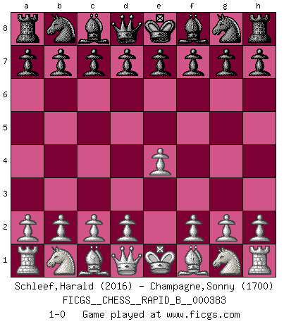 Last move : 1-0 2022 September 4 4:58:28 [Event "FICGS__CHESS__RAPID_B__000383"] [Site "FICGS"] [Date "2022.08.04"] [Round "1"] [White "Schleef,Harald"] [Black "Champagne,Sonny"] [Result "1-0"] [WhiteElo "2016"] [BlackElo "1700"] 1.e4 1-0 This chess game has been lost on time (started : 2022.08.04 20:23:42) Follow this game move after move (download)The laws of Chess do not permit a free choice: you have to move whether you like it or not. (Emanuel Lasker) Schach ist Krieg, im Schach geht es um testosterongesteuerte Urschreie. (Garry Kasparov) Yo he agregado estos principios a la ley: pongan los Caballos en acción antes de que los dos Alfiles sean desarrollados. (Emanuel Lasker) Ce n'est pas pour s'amuser qu'il joue aux échecs : il célèbre un culte. (Vladimir Nabokov) The smarter you play, the luckier you'll be. (Mark Pilarski)