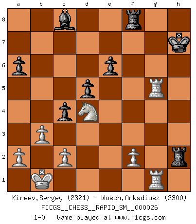 Last move : 1-0 2022 October 28 22:28:24 [Event "FICGS__CHESS__RAPID_SM__000026"] [Site "FICGS"] [Date "2022.08.06"] [Round "1"] [White "Kireev,Sergey"] [Black "Wosch,Arkadiusz"] [Result "1-0"] [WhiteElo "2321"] [BlackElo "2300"] 1.e4 c5 2.Nf3 Nc6 3.d4 cxd4 4.Nxd4 Nf6 5.Nc3 d6 6.Bg5 e6 7.Qd2 a6 8.Nxc6 bxc6 9.O-O-O h6 10.Bf4 d5 11.Qe3 Bb4 12.Be2 O-O 13.e5 Nd7 14.Qg3 Kh8 15.Qh3 Kh7 16.Bd3+ Kg8 17.Ne2 Be7 18.g4 Nc5 19.Bxh6 Nxd3+ 20.Rxd3 f6 21.Bf4 c5 22.Kb1 c4 23.Rg3 fxe5 24.Bxe5 Bd6 25.Re3 Rb8 26.Qg3 Qb6 27.b3 Bxe5 28.Qxe5 Rb7 29.Qh5 Qd8 30.Re1 Qf6 31.g5 g6 32.gxf6 gxh5 33.Rf3 Rbf7 34.Rg1+ Kh7 35.Rh3 Rxf6 36.Rxh5+ Rh6 37.Rhg5 Rxh2 38.Nd4 1-0 Follow this game move after move (download)What is the object of playing a gambit opening?... To acquire a reputation of being a dashing player at the cost of losing a game. (Siegbert Tarrasch) Schach ist gnadenlos. Du mußt bereit sein zu töten. (Nigel Short) Un jugador que es sorprendido, esta derrotado a medias. (Proverbio) Le jeu d'échecs est comme rejeté hors du temps. (Antoine de Saint-Exupéry) Creativity is allowing yourself to make mistakes. Art is knowing which ones to keep. (Scott Adams)