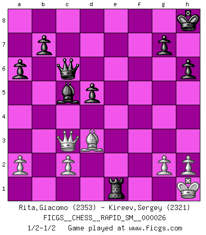 Last move : 1/2-1/2 2022 September 6 15:59:14 [Event "FICGS__CHESS__RAPID_SM__000026"] [Site "FICGS"] [Date "2022.08.06"] [Round "1"] [White "Rita,Giacomo"] [Black "Kireev,Sergey"] [Result "1/2-1/2"] [WhiteElo "2353"] [BlackElo "2321"] 1.e4 c5 2.Nf3 d6 3.d4 cxd4 4.Nxd4 Nf6 5.Nc3 a6 6.Bg5 e6 7.f4 Qb6 8.Qd3 Qxb2 9.Rb1 Qa3 10.f5 Be7 11.Be2 Qa5 12.O-O O-O 13.Bd2 Qc7 14.fxe6 fxe6 15.Qc4 Qd7 16.Qb3 Kh8 17.Na4 Nc6 18.Nxc6 Qxc6 19.Nb6 Rb8 20.Bd3 Bd7 21.Kh1 h6 22.Be3 d5 23.Nxd7 Nxd7 24.Rxf8+ Bxf8 25.Ba7 Nc5 26.exd5 exd5 27.Qc3 Re8 28.Bxc5 Bxc5 29.Re1 Rxe1+ 1/2-1/2 Follow this game move after move (download)Weak points or holes in the opponent's position must be occupied by pieces not Pawns. (Siegbert Tarrasch) Gewinnen beim Schach fördert das Selbstvertrauen. Beim Sex spüre ich sowas nicht... (Garry Kasparov) Tu puedes aprender mucho mas de una partida que pierdas que de una partida ganada. Tendras que perder cientos de partidas antes de llegar a ser un buen jugador. (Jose Raul Capablanca) Les erreurs sont comme les malheurs, elles n'arrivent jamais seules. (Siegbert Tarrasch) Don't anthropomorphize computers - they hate it. (Anonymous)