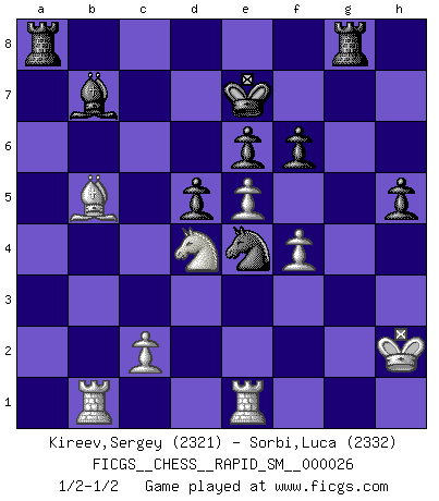 Last move : 1/2-1/2 2022 October 13 18:51:26 [Event "FICGS__CHESS__RAPID_SM__000026"] [Site "FICGS"] [Date "2022.08.06"] [Round "1"] [White "Kireev,Sergey"] [Black "Sorbi,Luca"] [Result "1/2-1/2"] [WhiteElo "2321"] [BlackElo "2332"] 1.d4 Nf6 2.Nf3 d5 3.Bf4 c5 4.e3 Nc6 5.Nbd2 Qb6 6.dxc5 Qxb2 7.Rb1 Qc3 8.Bb5 e6 9.O-O Be7 10.e4 O-O 11.e5 Nd7 12.Nb3 Qb4 13.Nfd4 Nxd4 14.Nxd4 Qxc5 15.Re1 a6 16.Bd3 g6 17.Nb3 Qc7 18.Qg4 h5 19.Qg3 Kg7 20.h4 Qd8 21.Bg5 Bxg5 22.hxg5 b5 23.Nd4 Nc5 24.Qf4 Bb7 25.Qf6+ Kg8 26.g4 Ne4 27.Qxd8 Rfxd8 28.gxh5 gxh5 29.f3 Nxg5 30.Kh2 Kf8 31.a4 Ke7 32.axb5 axb5 33.Bxb5 Rdc8 34.Kg3 f6 35.f4 Ne4+ 36.Kh2 Rg8 1/2-1/2 Follow this game move after move (download)He who fears an isolated Queen's Pawn should give up Chess. (Siegbert Tarrasch) Warum muß ich gegen diesen IDIOTEN verlieren? (Aaron Nimzowitsch) El Ajedrez moderno está demasiado preocupado con cosas como la estructura de Peones. Olvidenlo, el Jaque Mate termina la partida. (Nigel Short) Que feriez-vous si vous étiez en train de jouer aux échecs et que la fin du monde arrive ? Je continuerais à jouer. (Saint Borromée) Always remember that you are unique; just like everyone else. (Unknown)