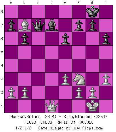 Last move : 1/2-1/2 2022 September 28 19:28:45 [Event "FICGS__CHESS__RAPID_SM__000026"] [Site "FICGS"] [Date "2022.08.06"] [Round "1"] [White "Markus,Roland"] [Black "Rita,Giacomo"] [Result "1/2-1/2"] [WhiteElo "2314"] [BlackElo "2353"] 1.d4 Nf6 2.c4 e6 3.Nf3 d5 4.Nc3 Bb4 5.Bg5 h6 6.Bxf6 Qxf6 7.e3 O-O 8.Rc1 dxc4 9.Bxc4 c5 10.Qb3 cxd4 11.Nxd4 Bxc3+ 12.Qxc3 Bd7 13.Nf3 Qe7 14.O-O Rc8 15.Qb3 Rc7 16.Rc3 Nc6 17.Bd3 Rac8 18.Rfc1 Na5 19.Rxc7 Rxc7 20.Qd1 Qd6 21.Rxc7 Qxc7 22.h3 b6 23.Ba6 Nb7 24.Bxb7 1/2-1/2 Follow this game move after move (download)Chess is a forcing house where the fruits of character can ripen more fully than in life. (Edward Morgan Foster) Du weisst es gibt ein Problem mit Computern und Fernschach, wenn jeder eine Rating von 2450 hat. (John Christen Knudsen) La pasion por jugar al Ajedrez es una de las mas inexplicables en el mundo. (H.G. Wells) Assurément je connaissais par expérience le mystérieux attrait de ce jeu royal, le seul entre tous les jeux inventés par les hommes qui échappe souverainement à la tyrannie du hasard, le seul où l'on ne doive sa victoire qu'à son intelligence ou plutôt à une certaine forme d'intelligence. Mais n'est-ce pas déjà le limiter injurieusement que d'appeler les échecs un jeu ? N'est-ce pas une science, un art ou quelque chose qui, comme le cercueil de Mahomet entre ciel et terre, est suspendu entre l'un et l'autre, et qui réunit un nombre incroyable de contraires ? [...] C'est une pensée qui ne mène à rien, une mathématique qui n'établit rien, un art qui ne laisse pas d'uvre, une architecture sans matière; et il l'a prouvé néanmoins qu'il était plus durable, à sa manière, que les livres ou que tout autre monument, ce jeu unique qui appartient à tous les peuples et à tous les temps, et dont personne ne sait quel dieu en fit don à la terre pour tuer l'ennui, pour aiguiser l'esprit et stimuler l'âme. Où commence-t-il, où finit-il ? (Stefan Zweig) Perseverance does not equal worthiness. Next time you want to get my attention, wear something fun. Low-riding jeans are hot. (Gregory House, House M.D.)