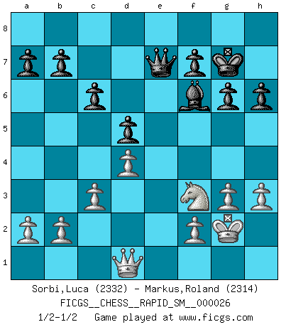 Last move : 1/2-1/2 2022 October 22 12:22:56 [Event "FICGS__CHESS__RAPID_SM__000026"] [Site "FICGS"] [Date "2022.08.06"] [Round "1"] [White "Sorbi,Luca"] [Black "Markus,Roland"] [Result "1/2-1/2"] [WhiteElo "2332"] [BlackElo "2314"] 1.e4 e5 2.Nf3 Nc6 3.Bb5 Nf6 4.O-O Nxe4 5.Re1 Nd6 6.Nxe5 Be7 7.Bf1 Nxe5 8.Rxe5 O-O 9.d4 Bf6 10.Re1 Re8 11.c3 Rxe1 12.Qxe1 Ne8 13.Bf4 d5 14.Nd2 Bf5 15.Qe3 Nd6 16.Nf3 c6 17.Re1 h6 18.Bxd6 Qxd6 19.Bd3 Bxd3 20.Qxd3 g6 21.g3 Kg7 22.Kg2 Rc8 23.h3 Rc7 24.Qd1 Re7 25.Rxe7 Qxe7 1/2-1/2 Follow this game move after move (download)Modern Chess is too much concerned with things like Pawn structure. Forget it, Checkmate ends the game. (Nigel Short) Ein bischen Romantik kann weder im Schach noch in der Liebe schaden. Also versuche ich mich ab und zu daran zu erinnern. (Nigel Short) Yo nunca en mi vida he jugado la Defensa Francesa, que viene siendo la más aburrida de todas las Aperturas. (Wilhelm Steinitz) Les Echecs représentent une sphère d'idées créatrices basée sur la volonté des deux protagonistes. (Smyslov) There are more things in heaven and earth than practically anywhere else. (Unknown)