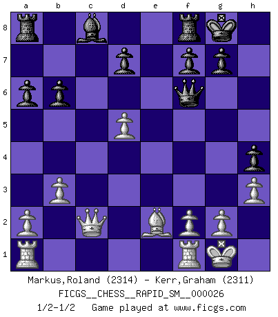 Last move : 1/2-1/2 2022 October 22 22:40:1 [Event "FICGS__CHESS__RAPID_SM__000026"] [Site "FICGS"] [Date "2022.08.06"] [Round "1"] [White "Markus,Roland"] [Black "Kerr,Graham"] [Result "1/2-1/2"] [WhiteElo "2314"] [BlackElo "2311"] 1.b3 e5 2.Bb2 Nc6 3.e3 Nf6 4.Nf3 e4 5.Nd4 h5 6.c4 Bc5 7.d3 Nxd4 8.exd4 Bb4+ 9.Bc3 Be7 10.d5 c6 11.Be2 O-O 12.dxe4 Nxe4 13.O-O Bf6 14.Bxf6 Qxf6 15.Na3 h4 16.Qc2 cxd5 17.cxd5 Nd6 18.h3 b6 19.Nb5 Nxb5 20.Bxb5 a6 21.Be2 1/2-1/2 Follow this game move after move (download)Bobby Fischer is the greatest Chess player who has ever lived. (Ken Smith) Im Internet Chess Club betrug mein Rating vorübergehend 3350 ELO-Punkte. (Sergej Karjakin) El pensamiento metódico es mas útil en el Ajedrez que la inspiración. (C. J. S. Purdy) Lorsque vous vous retrouvez devant une position atroce, ne tendez pas un ultime piège dérisoire avec l'intention d'abandonner si l'adversaire le déjoue ! Faites-vous plutôt un devoir de résister comme si votre vie en dépendait. Jouez le coup qui vous déplairait au centuple si vous étiez dans la peau de votre tortionnaire ! Luck never made a man wise. (Seneca, Letters to Lucilius)