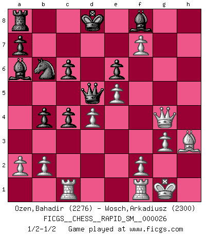 Last move : 1/2-1/2 2022 September 21 0:15:55 [Event "FICGS__CHESS__RAPID_SM__000026"] [Site "FICGS"] [Date "2022.08.06"] [Round "1"] [White "Ozen,Bahadir"] [Black "Wosch,Arkadiusz"] [Result "1/2-1/2"] [WhiteElo "2276"] [BlackElo "2300"] 1.d4 Nf6 2.c4 e6 3.Nf3 d5 4.Nc3 c6 5.Bg5 dxc4 6.e4 b5 7.e5 h6 8.Bh4 g5 9.Nxg5 hxg5 10.Bxg5 Nbd7 11.g3 Rg8 12.h4 Rxg5 13.hxg5 Nd5 14.g6 Qa5 15.gxf7+ Kd8 16.Rc1 Ba6 17.Bh3 b4 18.Nxd5 Qxd5 19.O-O Nb6 20.Qg4 1/2-1/2 Follow this game move after move (download)Chess is not like life... it has rules ! (Mark Pasternak) Capablanka war das größte Genie der Schachgeschichte! Aber denken sie nicht er habe nichts vom Schach verstanden. Er wusste nur soviel wie er wissen musste um seine Ziele zu erreichen. (Mikhail Moiseyevich Botvinik) Yo he agregado estos principios a la ley: pongan los Caballos en acción antes de que los dos Alfiles sean desarrollados. (Emanuel Lasker) Un footballeur joue avec ses pieds, parfois avec sa tête. Un joueur d'échecs ne joue qu'avec sa tête. Et quand il ne joue plus, il meurt. (Jacob Murray) Do you know these so called Volunteers don't even get paid! (Simpsons)