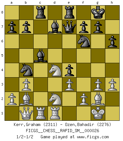 Last move : 1/2-1/2 2022 September 27 9:36:28 [Event "FICGS__CHESS__RAPID_SM__000026"] [Site "FICGS"] [Date "2022.08.06"] [Round "1"] [White "Kerr,Graham"] [Black "Ozen,Bahadir"] [Result "1/2-1/2"] [WhiteElo "2311"] [BlackElo "2276"] 1.Nf3 d5 2.d4 Nf6 3.g3 c5 4.Bg2 cxd4 5.O-O h6 6.b3 e6 7.Bb2 Bc5 8.Nxd4 O-O 9.c4 e5 10.Nf3 e4 11.Nd4 Re8 12.cxd5 Nxd5 13.e3 Nd7 14.Nd2 N7f6 15.Rc1 Bg4 16.Qc2 Rc8 17.Qb1 Qe7 18.h3 Bd7 19.Rfd1 Nb4 1/2-1/2 Follow this game move after move (download)Spassky will not be psyched out by Fischer. (Mike Goodall) Ich war schon mal beim Dopingtest. Da musste ich Urin abgeben, während Dritte zusahen. (Elisabeth Pähtz) El juego de Fischer siempre fue nítido, racional y brillante. Uno de los mejores por siempre. (Dave Regis) Les échecs, c'est l'imagination. (David Bronstein) To err is human, but to really foul things up requires a computer. (Farmer's Almanac, 1978)