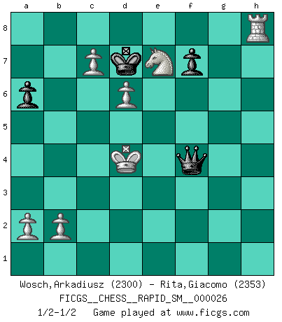 Last move : 1/2-1/2 2022 December 21 23:35:9 [Event "FICGS__CHESS__RAPID_SM__000026"] [Site "FICGS"] [Date "2022.08.06"] [Round "1"] [White "Wosch,Arkadiusz"] [Black "Rita,Giacomo"] [Result "1/2-1/2"] [WhiteElo "2300"] [BlackElo "2353"] 1.e4 c5 2.Nf3 d6 3.d4 cxd4 4.Nxd4 Nf6 5.Nc3 a6 6.Be3 e5 7.Nb3 Be6 8.f3 h5 9.Qd2 Nbd7 10.Nd5 Bxd5 11.exd5 g6 12.O-O-O Nb6 13.Qa5 Bh6 14.Bxh6 Rxh6 15.g3 h4 16.g4 g5 17.h3 Rc8 18.Kb1 Nc4 19.Bxc4 Rxc4 20.Rhe1 Qxa5 21.Nxa5 Rf4 22.Nxb7 Kd7 23.Rd3 Rd4 24.Rxd4 exd4 25.f4 gxf4 26.c4 f3 27.Kc2 Nh7 28.Rf1 Ng5 29.c5 Nxh3 30.Nxd6 Ng5 31.Nf5 Rh8 32.Kd3 h3 33.c6+ Kc7 34.Rc1 f2 35.d6+ Kd8 36.Ng3 Nf3 37.c7+ Kd7 38.Rf1 Ne5+ 39.Kxd4 Nxg4 40.Nf5 h2 41.Ne7 h1Q 42.Rxh1 Nh2 43.Rxh2 f1Q 44.Rxh8 Qf4+ 1/2-1/2 Follow this game move after move (download)Chess is as much a mystery as women. (Purdy) Wie ich sie so einen nach dem anderen nieder mähte wurde meine Überlegenheit offensichtlich. (José Raúl Capablanca) Me dio la sensación de como si yo estuviera jugando en contra del mismo Ajedrez. - al estar jugando en contra de Robert Fischer (Walter Shipman) Je crois qu'il existe des manières très spécifiques de jouer efficacement contre une machine. Evidemment, nous n'avons aucune chance en technique pure, parce que l'ordinateur calcule de manière parfaite. Mais lorsque nous faisons appel à notre cerveau, en utilisant l'intuition et la compréhension, alors nous restons beaucoup plus forts. (Anatoli Karpov) A good teacher is like a candle - it consumes itself to light the way for others. (Author unknown)