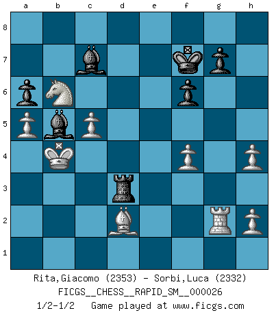 Last move : 1/2-1/2 2023 January 10 18:35:20 [Event "FICGS__CHESS__RAPID_SM__000026"] [Site "FICGS"] [Date "2022.08.06"] [Round "1"] [White "Rita,Giacomo"] [Black "Sorbi,Luca"] [Result "1/2-1/2"] [WhiteElo "2353"] [BlackElo "2332"] 1.e4 e5 2.Nf3 Nc6 3.Bb5 a6 4.Ba4 Nf6 5.O-O Be7 6.Re1 b5 7.Bb3 O-O 8.c3 d5 9.exd5 Nxd5 10.Nxe5 Nxe5 11.Rxe5 c6 12.Re1 Bd6 13.d3 Bf5 14.Qf3 Qh4 15.g3 Qh3 16.Be3 Bxd3 17.Nd2 Bf5 18.Bxd5 cxd5 19.Qxd5 Rfd8 20.Qf3 Bg4 21.Qg2 Qxg2+ 22.Kxg2 b4 23.Nc4 bxc3 24.bxc3 Bc7 25.a4 Rab8 26.a5 Rb3 27.Bd4 Be6 28.Nb6 h5 29.Reb1 Rxb1 30.Rxb1 f6 31.f4 Kf7 32.Kf3 Kg6 33.Re1 Kf7 34.Rf1 Kg6 35.Rc1 Bg4+ 36.Kf2 h4 37.Ra1 Be6 38.Kf3 Kf7 39.gxh4 Kg6 40.Rg1+ Kf7 41.Ke4 Re8 42.Kf3 Bf5 43.Kg3 Be6 44.Be3 Rd8 45.Kf3 Rd3 46.Rc1 Kg6 47.Ke2 Bf5 48.c4 Ra3 49.c5 Bd3+ 50.Kd2 Bb5 51.Rc3 Ra2+ 52.Rc2 Ra1 53.Kc3 Bc6 54.Kb4 Rb1+ 55.Kc4 Re1 56.Kd4 Rd1+ 57.Kc3 Ra1 58.Kb4 Rb1+ 59.Kc4 Kf7 60.Rf2 Re1 61.Kd4 Ra1 62.Bd2 Bb5 63.Kc3 Ra3+ 64.Kb4 Rd3 65.Bc3 Re3 66.Bd2 Rd3 67.Rg2 Rh3 68.Nc4 Rd3 69.Bc3 Rf3 70.Bd2 Rd3 71.Nb6 Rh3 72.Nc8 Rd3 73.Nb6 1/2-1/2 Follow this game move after move (download)We like to think. (Gary Kasparov) Auf Remis zu spielen ist gewissermaßen ein Verbrechen gegen das Schachspiel. (Mikhail Nekhemyevich Tal) Muchos se han convertido en Maestros de Ajedrez, nadie se ha convertido en el Maestro del Ajedrez. (Siegbert Tarrasch) Si le désir cupide (et stupide) de gagner est une inépuisable source de souffrance, une combinaison brillante sur l'échiquier est une découverte : le coquelicot qui s'épanouit lorsque apparaît la Voie Lactée. (Arrabal) Employ the attack like tactic of defense. (Chinese proverb)