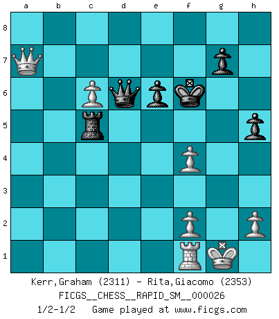 Last move : 1/2-1/2 2022 November 24 17:22:32 [Event "FICGS__CHESS__RAPID_SM__000026"] [Site "FICGS"] [Date "2022.08.06"] [Round "1"] [White "Kerr,Graham"] [Black "Rita,Giacomo"] [Result "1/2-1/2"] [WhiteElo "2311"] [BlackElo "2353"] 1.Nf3 d5 2.d4 Nf6 3.g3 Bf5 4.Bg2 e6 5.O-O Be7 6.c4 c6 7.Nc3 h6 8.Nd2 Nbd7 9.e4 dxe4 10.Ndxe4 O-O 11.Re1 Nxe4 12.Nxe4 Nf6 13.Bf4 Rc8 14.Be5 Bxe4 15.Bxe4 Nxe4 16.Rxe4 Bd6 17.Qb3 Bxe5 18.dxe5 Qc7 19.Rd1 Rcd8 20.Rd6 Rxd6 21.exd6 Qxd6 22.Qxb7 a5 23.b3 f5 24.Re1 f4 25.Qb6 Rf5 26.a3 Qd2 27.Rf1 Qd6 28.b4 axb4 29.axb4 h5 30.b5 Rc5 31.bxc6 Rxc4 32.Qa5 Rc5 33.Qa8+ Kf7 34.Qa7+ Kf6 35.gxf4 1/2-1/2 Follow this game move after move (download)Openings teach you openings. Endgames teach you chess ! (Stephan Gerzadowicz) Schach ist die gewalttätigste aller Sportarten. (Garry Kasparov) El Ajedrez moderno está demasiado preocupado con cosas como la estructura de Peones. Olvidenlo, el Jaque Mate termina la partida. (Nigel Short) Mon pion favori sur ma case favorite ! Bronstein en parlant d'un coup de pion en h5 quand il avait les Noirs. Real knowledge is to know the extent of one's ignorance. (Confucius)