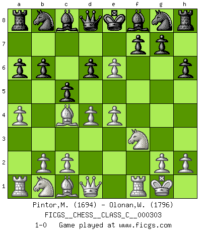 Last move : 1-0 2022 September 18 8:18:49 [Event "FICGS__CHESS__CLASS_C__000303"] [Site "FICGS"] [Date "2022.08.06"] [Round "1"] [White "Pintor,Manuel"] [Black "Olonan,Wilfredo Olanka"] [Result "1-0"] [WhiteElo "1694"] [BlackElo "1796"] 1.e4 c5 2.f4 a6 3.Nf3 d6 4.a4 b6 5.Bc4 e6 6.O-O h6 7.d4 Bb7 8.f5 Bc8 9.fxe6 1-0 This chess game has been lost on time (started : 2022.08.06 19:28:18) Follow this game move after move (download)Chess is imagination. (David Bronstein) Über Frauen: Chess is better. (Robert James Fischer) Ciertamente, de todas la drogas del mundo, el Ajedrez debe ser el mas placentero permamentemente. (Assiac) Aidez vos pièces, elles vous aideront. (Paul Morphy) Beta. Software undergoes beta testing shortly before it's released. Beta is latin for still doesn't work. (Anonymous)