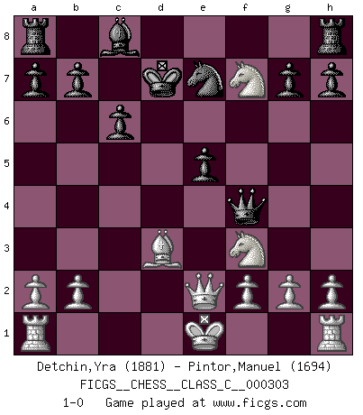 Last move : 1-0 2022 August 16 1:58:32 [Event "FICGS__CHESS__CLASS_C__000303"] [Site "FICGS"] [Date "2022.08.06"] [Round "1"] [White "Detchin,Yra"] [Black "Pintor,Manuel"] [Result "1-0"] [WhiteElo "1881"] [BlackElo "1694"] 1.e4 e5 2.Nf3 Nc6 3.Bb5 Bc5 4.c3 Qf6 5.d4 exd4 6.e5 Nxe5 7.Qe2 c6 8.Bd3 d6 9.cxd4 Bb4+ 10.Bd2 Bxd2+ 11.Nbxd2 Ne7 12.dxe5 dxe5 13.Ne4 Qf4 14.Nd6+ Kd7 15.Nxf7 1-0 Follow this game move after move (download)Everything is in a state of flux, and this includes the world of Chess. (Mikhail Botvinnik) Ich verstehe mehr vom Schach als irgendein anderer lebender Meister. (José Raúl Capablanca) El jugador de combinación piensa hacia adelante; comienza de la posición dada y trabaja las movidas contundentes en su mente. (Emanuel Lasker) Dieu déplace le joueur, et celui-ci la pièce. Quel Dieu derrière Dieu commence donc la trame ? Arturo Perez-Reverte (prix de littérature policière 1993). The weakness of an artist is dogma. (Josh Waitzkin)