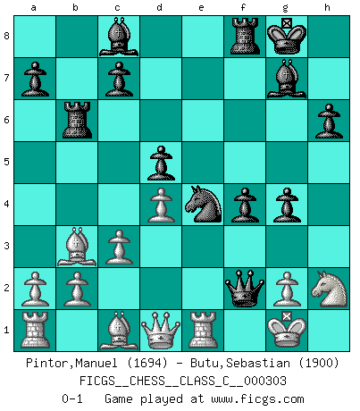 Last move : 0-1 2022 August 24 0:41:24 [Event "FICGS__CHESS__CLASS_C__000303"] [Site "FICGS"] [Date "2022.08.06"] [Round "1"] [White "Pintor,Manuel"] [Black "Butu,Sebastian"] [Result "0-1"] [WhiteElo "1694"] [BlackElo "1900"] 1.e4 e5 2.f4 exf4 3.Nf3 d6 4.Bc4 h6 5.O-O g5 6.d4 Nc6 7.c3 Nf6 8.h3 Nxe4 9.Re1 d5 10.Bb5 Bg7 11.Nbd2 f5 12.Ne5 O-O 13.Nxc6 bxc6 14.Bxc6 Rb8 15.Nf3 Rb6 16.Ba4 g4 17.hxg4 fxg4 18.Nh2 Qh4 19.Bb3 Qf2+ 0-1 Follow this game move after move (download)A sacrifice is best refuted by accepting it. (Wilhelm Steinitz) Sehr viele beherrschen heutzutage das große Einmalseins des Schachspiels und kennen sogar dessen Logarithmentafeln auswendig - deshalb sollte man hin und wieder zu beweisen trachten, dass zwei mal zwei auch fünf sein kann. (Mikhail Nekhemyevich Tal) El Ajedrez es una manera fabulosa para que los niños aprendan a autovalorarse y a autoestimarse. (Saudin Robovic) D'abord les bases : Jouez et étudiez, puis étudiez et jouez, ensuite jouez et étudiez, puis étudiez et jouez. Deuxièmement : Donnez toujours le meilleur de vous-même ! (Ken Smith) Memory... is the diary that we all carry with us. (Oscar Wilde, The Importance of Being Earnest)