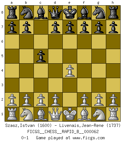 Last move : 0-1 2007 September 11 1:49:25 [Event "FICGS__CHESS__RAPID_B__000062"] [Site "FICGS"] [Date "2007.08.09"] [Round "1"] [White "Szasz,Istvan"] [Black "Livenais,Jean-Rene"] [Result "0-1"] [WhiteElo "1600"] [BlackElo "1737"] 1.e4 c5 0-1 This chess game has been lost on time (started : 2007.08.09 6:54:57) Sicilian defense Player Black won this chess game. Follow this game move after move (download)Fischer sacrificed virtually everything most of us weakies (to use his term) value, respect, and cherish, for the sake of an artful, often beautiful board game, for the ambivalent privilege of being its greatest master. (Paul Kollar) Ich las kürzlich ein Buch von Nietzsche. Er sagte Religion verdumme nur die Menschen. Ich stimme zu. (Robert James Fischer) Combinaciones deslumbrantes son para la mayoría, mover madera es para los pocos. (Georg Kieninger) Les échecs sont utiles à l'exercice de la faculté de penser et à celle de l'imagination. Car nous devons posséder une méthode élaborée pour atteindre des buts partout où nous devons conduire notre raison. (Leibnitz) Luck never gives; it only lends. (Swedish proverb)