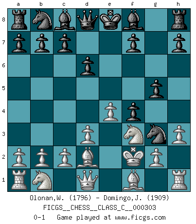 Last move : 0-1 2022 October 26 6:49:41 [Event "FICGS__CHESS__CLASS_C__000303"] [Site "FICGS"] [Date "2022.08.06"] [Round "1"] [White "Olonan,Wilfredo Olanka"] [Black "Domingo,Jordi"] [Result "0-1"] [WhiteElo "1796"] [BlackElo "1909"] 1.e4 e5 2.f4 exf4 3.Nf3 d6 4.h3 Nf6 5.d3 Nh5 6.Kf2 g5 7.Bd2 Ng3 0-1 This chess game has been lost on time (started : 2022.08.06 19:28:18) Follow this game move after move (download)The game of Chess is not merely an idle amusement; several very valuable qualities of the mind are to be acquired and strengthened by it, so as to become habits ready on all occasions; for life is a kind of Chess. (Benjamin Franklin) Ich bin stolz ein Bulgare zu sein. (Veselin Topalov) Todo se encuentra en un estado de flujo y esto incluye al mundo del Ajedrez. (Mikhail Botvinnik) Il (Jacob Murray) ne joue pas pour le bon coup, mais pour le meilleur. (Eloi Relange) Kids, you tried your best and you failed miserably. The lesson is, never try. (Simpsons)
